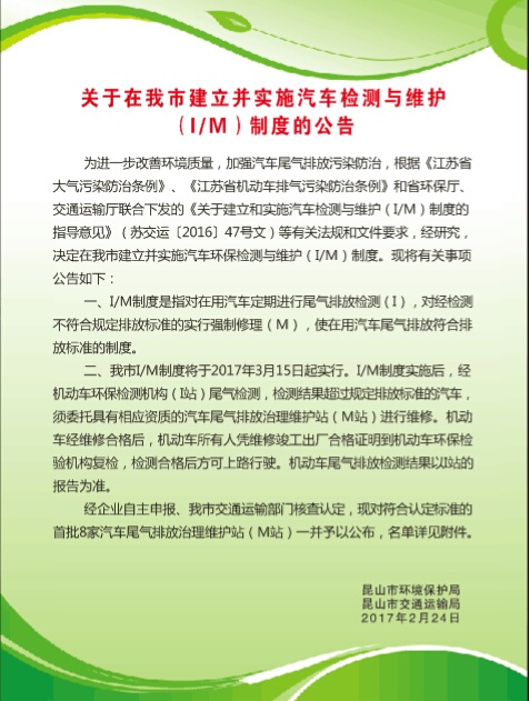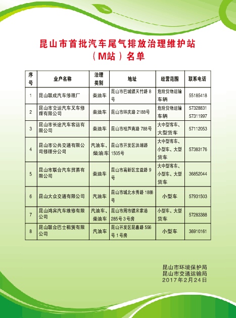 根據(jù)蘇州市環(huán)境保護局〔2016〕8號文件關(guān)于建汽車尾氣排放治理維護站(M站)通知的精神,公交修理分公司成功申報了昆山市第一批汽車尾氣排放治理維護站(M站)資格。3月15日,M站建成啟用,設(shè)有專用尾氣治理車間和工位和專用尾氣檢測設(shè)備等。